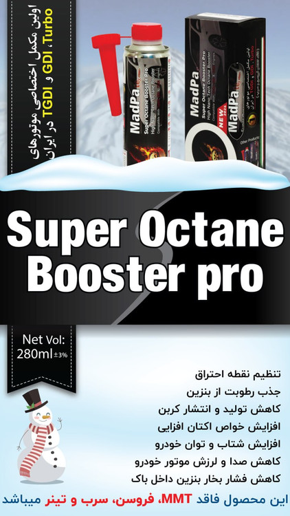 این مکمل سوخت فوق العاده که غالبا برای موتورهای توربو، GDI و تقویت شده استفاده می شود، جدیدترین و قوی ترین محلول نانو تکنولوژی موجود در کشور مخصوص اضافه کردن به داخل باک بنزین می باشد. مدپا سوپر اکتان بوستر یک مکمل بسیار قدرتمند است که در دسته مکمل های شتاب دهنده قرار دارد. این مکمل نانو عدد اکتان قطعی (MON) را تا 4 واحد افزایش می دهد. سوپر اکتان بوستر جدیدترین محصول تولید شده با فناوری نانو می باشد که با قدرت روان کنندگی بالا پس از ترکیب با بنزین باعث روان تر شدن حرکت پیستون داخل سیلندر میشود محلول سوپر اکتان بوستر مدپا با جلوگیری از تولید کربن و دوده و ممانعت از رسوب ناخالصی های بنزین در محفظه احتراق نقش مهمی در محافظت از محفظه داخل سیلندر(محفظه احتراق) و سوپاپ ها (دریچه های سوخت و دود ) و افزایش طول عمر موتور دارد. افطایش شتاب و کاهش ناک موتور از دیگر مزایای این مکمل می باشد. با مصرف این مکمل موتور ماشین خود را بیمه نمایید.